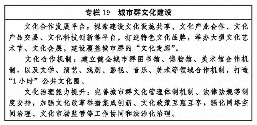 加強區(qū)域文化協同創(chuàng)新,健全合作互助、扶持補償機制,推動東部地區(qū)以創(chuàng)新引領文化發(fā)展,加大力度支持中西部地區(qū)以及東北等老工業(yè)基地文化發(fā)展,扶持革命老區(qū)、民族地區(qū)、邊疆地區(qū)文化發(fā)展,形成相互促進、優(yōu)勢互補、融合互動的區(qū)域文化發(fā)展格局。圍繞京津冀協同發(fā)展、長江經濟帶發(fā)展、粵港澳大灣區(qū)建設、長三角一體化發(fā)展、黃河流域生態(tài)保護和高質量發(fā)展等區(qū)域重大戰(zhàn)略,健全推進區(qū)域內文化協同發(fā)展機制,提升公共文化設施互聯互通水平,加強區(qū)域文化產業(yè)帶建設,實現區(qū)域文化建設水平整體提高。促進形成文化產業(yè)發(fā)展新格局,創(chuàng)新城市群文化一體化發(fā)展體制機制,共建高水平合作平臺,加強公共文化服務便利共享。完善以城帶鄉(xiāng)、城鄉(xiāng)融合的文化發(fā)展體制機制,發(fā)揮城市帶動輻射作用,加快城鄉(xiāng)間文化要素雙向流動,形成以點帶面、特色鮮明、優(yōu)勢互補、均衡配置的城鄉(xiāng)文化發(fā)展新格局。
