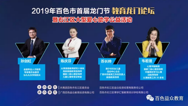 為了給百色的家長和孩子們奉獻一場空前的教育盛宴,論壇邀請到中國商業(yè)禮儀研究院執(zhí)行院長孫劍虹,廣西金珊瑚教育集團董事長陳慶芬,南寧市婦女兒童活動中心主任蘇長帥,中國心理健康教育研究院專家韋若理。4位教育名家齊聚一堂,為百色的家長和孩子們帶來了關于家風建設、家庭教育、芬蘭先進兒童教育理念、兒童專注力培養(yǎng)領域的深刻研究見解,贏得了到場家長的肯定和掌聲。