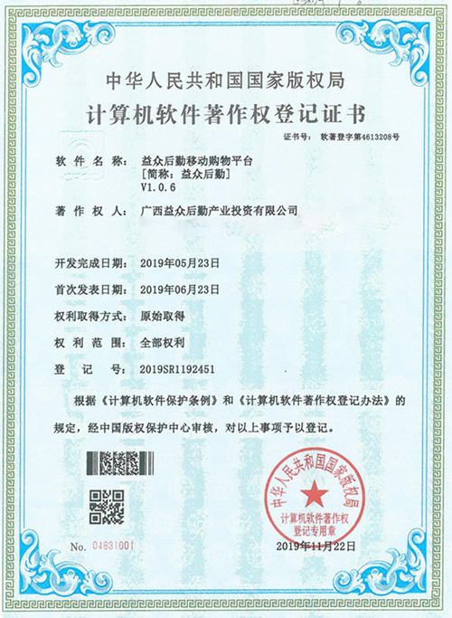 日前,經(jīng)中國版權(quán)保護中心審核,由益眾后勤公司提交的《益眾后勤移動購物平臺》符合《計算機軟件保護條例》和《計算機軟件著作權(quán)登記辦法》的相關(guān)規(guī)定,被認定為原始取得,并獲得中華人民共和國國家版權(quán)局頒發(fā)的《計算機軟件著作權(quán)登記證書》。