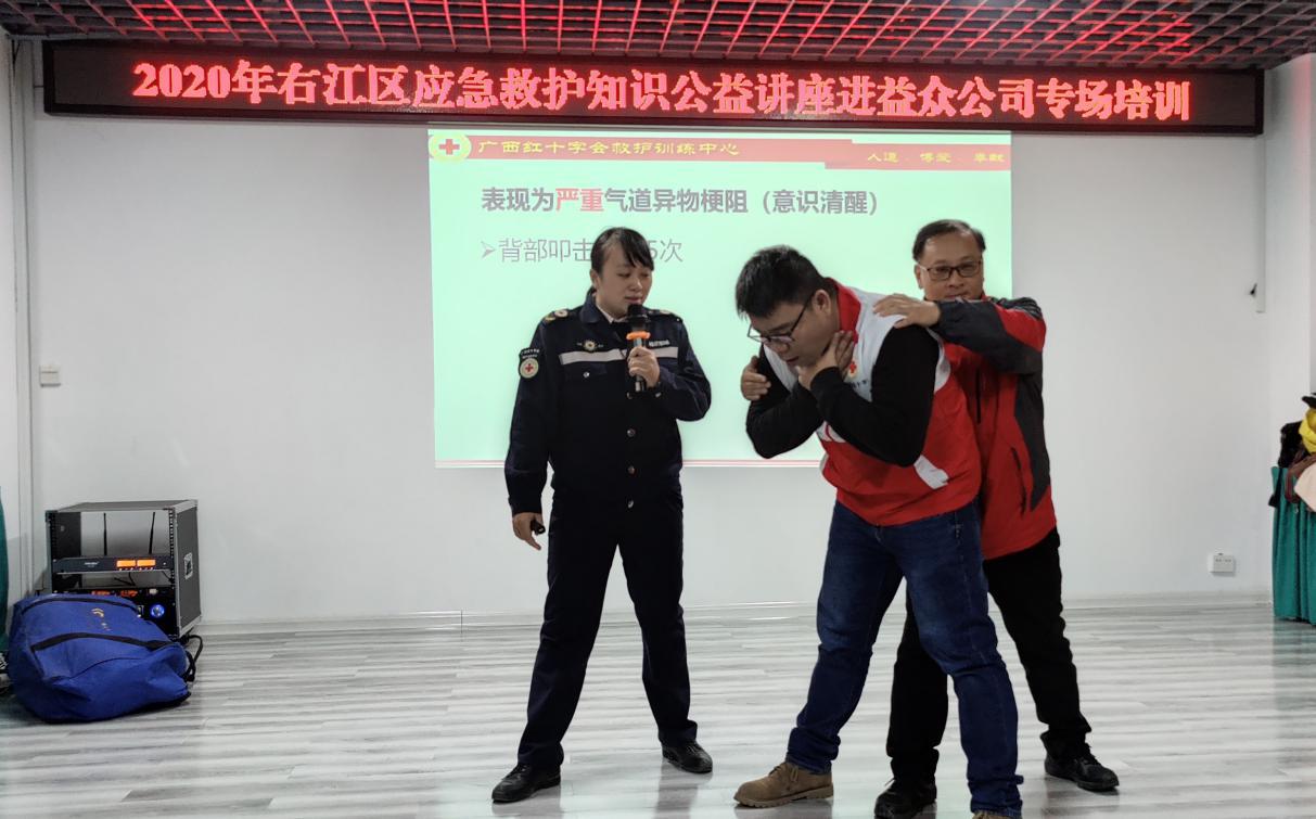 ????????為普及應(yīng)急救護(hù)知識(shí),提高員工安全防范意識(shí)、自救互救能力和應(yīng)急救護(hù)技能,12月2日、6日,益眾公司邀請(qǐng)百色市右江區(qū)紅十字會(huì)到公司開展急救知識(shí)技能培訓(xùn),公司百余名管理人員、有關(guān)直屬班組400余人參加培訓(xùn)。