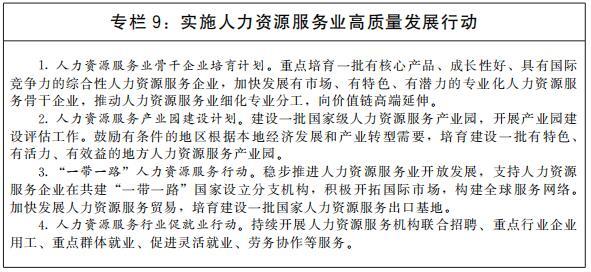 加快人力資源服務業(yè)高質量發(fā)展。推動人力資源服務與實體經濟融合發(fā)展,引導人力資源服務機構圍繞產業(yè)基礎高級化、產業(yè)鏈現代化提供精準專業(yè)服務。鼓勵人力資源服務業(yè)管理創(chuàng)新、技術創(chuàng)新、服務創(chuàng)新和產品創(chuàng)新,大力發(fā)展人力資源管理咨詢、高級人才尋訪、人才測評等高技術、高附加值業(yè)態(tài)。實施人力資源服務業(yè)領軍人才培養(yǎng)計劃。開展“互聯網+人力資源服務”行動。深化人力資源服務領域對外開放,探索建設國家人力資源服務出口基地。