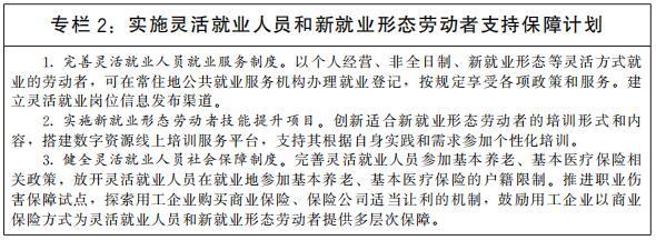 支持多渠道靈活就業(yè)和新就業(yè)形態(tài)發(fā)展。破除各種不合理限制,建立促進多渠道靈活就業(yè)機制,支持和規(guī)范發(fā)展新就業(yè)形態(tài)。鼓勵傳統行業(yè)跨界融合、業(yè)態(tài)創(chuàng)新,增加靈活就業(yè)和新就業(yè)形態(tài)就業(yè)機會。加快落實《關于維護新就業(yè)形態(tài)勞動者勞動保障權益的指導意見》,建立完善適應靈活就業(yè)和新就業(yè)形態(tài)的勞動權益保障制度,引導支持靈活就業(yè)人員和新就業(yè)形態(tài)勞動者參加社會保險,提高靈活就業(yè)人員和新就業(yè)形態(tài)勞動者社會保障水平。規(guī)范平臺企業(yè)用工,明確平臺企業(yè)勞動保護責任。健全職業(yè)分類動態(tài)調整機制,持續(xù)開發(fā)新職業(yè),發(fā)布新職業(yè)標準。