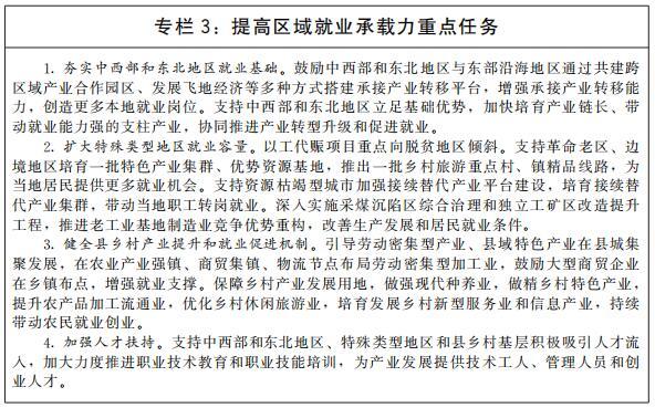 推動區(qū)域就業(yè)協調發(fā)展。支持東部地區(qū)發(fā)揮創(chuàng)新要素集聚優(yōu)勢,率先實現產業(yè)升級,開拓高質量就業(yè)新領域,培育高質量就業(yè)增長極。加快完善中西部和東北地區(qū)基礎設施,提升產業(yè)集聚區(qū)公共服務效能,引導產業(yè)向中西部和東北地區(qū)有序梯度轉移,推動就業(yè)機會向中西部和東北地區(qū)擴散。支持中西部和東北地區(qū)根據國家戰(zhàn)略導向和發(fā)展重點,對接先進生產要素和創(chuàng)新資源,發(fā)展特色優(yōu)勢產業(yè),改造提升傳統產業(yè),積極布局新興產業(yè),厚植就業(yè)創(chuàng)業(yè)沃土。