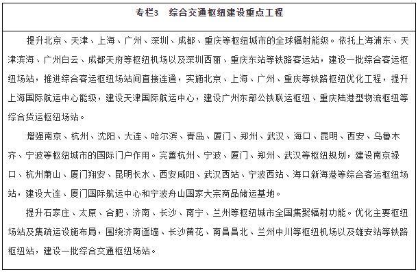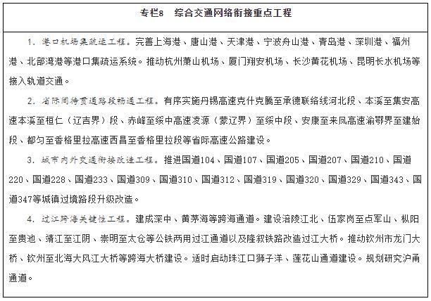 建設(shè)多節(jié)點、網(wǎng)格狀、全覆蓋的京津冀一體化綜合交通網(wǎng)絡(luò),基本建成軌道上的京津冀,高標準、高質(zhì)量打造雄安新區(qū)對外交通網(wǎng)絡(luò),加強北京城市副中心與中心城區(qū)、廊坊北三縣交通基礎(chǔ)設(shè)施互聯(lián)互通,強化北京冬奧會、冬殘奧會交通保障。依托長江黃金水道,整體設(shè)計推進長江經(jīng)濟帶綜合交通運輸體系建設(shè),補強沿江高鐵和鐵路貨運能力,全力打通公路省際待貫通路段,提升江海聯(lián)運、鐵水聯(lián)運發(fā)展水平。推進粵港澳大灣區(qū)基礎(chǔ)設(shè)施互聯(lián)互通,優(yōu)化航運和航空資源配置,加強港澳與內(nèi)地的交通聯(lián)系,支持香港提升國際航運、國際航空樞紐地位。推動長三角地區(qū)交通運輸更高質(zhì)量一體化發(fā)展,加快對外交通、城際交通、都市圈交通高效銜接和有機融合,協(xié)同推進港航、海事一體化發(fā)展,推動上海市、江蘇省、浙江省、安徽省共建輻射全球的航運樞紐,加快提升江蘇通州灣江海聯(lián)動示范區(qū)功能,打造長江集裝箱運輸新出海口。構(gòu)建海南島內(nèi)暢通、陸島連通、全球通達的現(xiàn)代綜合交通運輸體系,建設(shè)現(xiàn)代化綜合交通樞紐,穩(wěn)步推進自由貿(mào)易港建設(shè)。構(gòu)建黃河流域綠色安全便捷綜合交通網(wǎng)絡(luò),強化跨區(qū)域大通道建設(shè)。