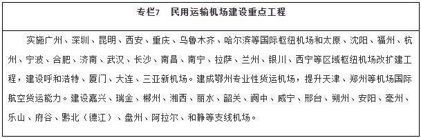 擴大航空網(wǎng)絡(luò)覆蓋。推動區(qū)域機場群協(xié)同發(fā)展,建設(shè)京津冀、長三角、粵港澳大灣區(qū)、成渝等世界級機場群。適時啟動能力緊張樞紐機場改擴建工程,強化樞紐機場綜合保障能力。合理加密機場布局,穩(wěn)步建設(shè)支線機場和專業(yè)性貨運樞紐機場,提升綜合性機場貨運能力和利用率。有序推進通用機場規(guī)劃建設(shè),構(gòu)建區(qū)域短途運輸網(wǎng)絡(luò),探索通用航空與低空旅游、應(yīng)急救援、醫(yī)療救護、警務(wù)航空等融合發(fā)展。優(yōu)化航路航線網(wǎng)絡(luò),加強軍民航空管基礎(chǔ)設(shè)施建設(shè),推廣應(yīng)用空管新技術(shù)。