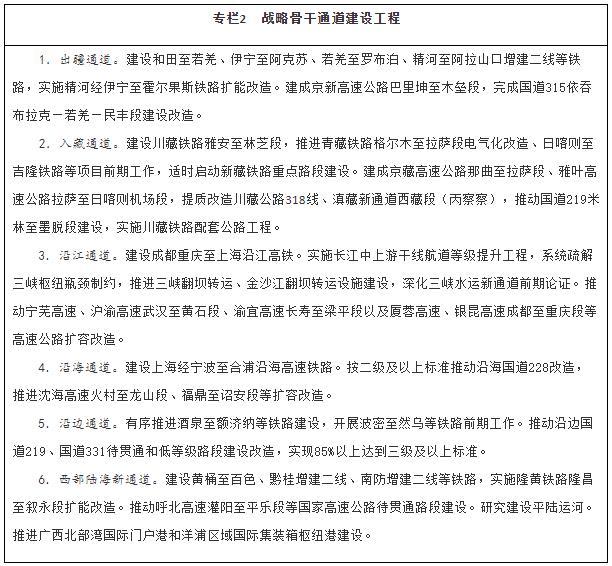 加強戰(zhàn)略骨干通道建設(shè)。推進出疆入藏通道建設(shè),擴大甘新、青新、青藏、川藏四條內(nèi)聯(lián)主通道通行能力,穩(wěn)步推進川藏鐵路建設(shè),加快推進新藏鐵路和田至日喀則段前期工作、適時啟動重點路段建設(shè),有序推進滇藏鐵路前期工作,密實優(yōu)化航空航線網(wǎng)絡(luò)布局,構(gòu)建多向聯(lián)通的通道布局。暢通沿江通道,加快建設(shè)沿江高鐵,優(yōu)化以高等級航道和干線鐵路、高速公路為骨干的沿江綜合運輸大通道功能。升級沿海通道,提高鐵路通道能力,推進高速公路繁忙路段擴容改造,提升港口航道整體效能,構(gòu)建大容量、高品質(zhì)的運輸走廊。貫通沿邊通道,提級改造普通國省干線,推進重點方向沿邊鐵路建設(shè),提高安全保障水平。建設(shè)西部陸海新通道,發(fā)揮鐵路在陸路運輸中的骨干作用和港口在海上運輸中的門戶作用,強化東、中、西三條通路,形成大能力主通道,銜接國際運輸通道。