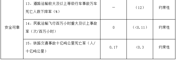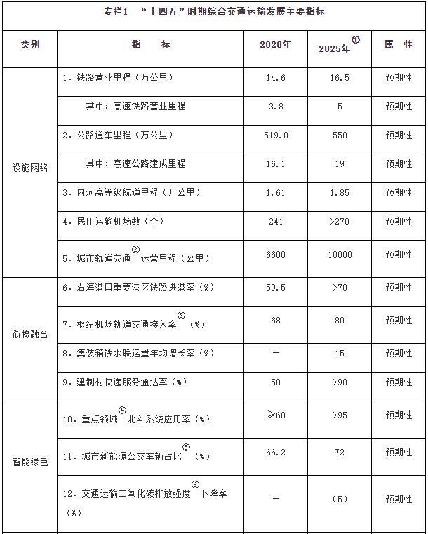注:①〔〕內(nèi)為5年累計數(shù)。②指納入國家批準的城市軌道交通建設(shè)規(guī)劃中的大中運量城市軌道交通項目。③指國際樞紐機場和區(qū)域樞紐機場中連通軌道交通的機場數(shù)量占比。④指重點營運車輛、郵政快遞自有干線運輸車輛、應(yīng)安裝具備衛(wèi)星定位功能船載設(shè)備的客船及危險品船等。⑤指新能源公交車輛占所有地面公交車輛的比重。⑥指按單位運輸周轉(zhuǎn)量計算的二氧化碳排放。