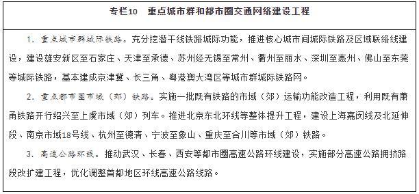 強化重點城市群城際交通建設(shè)。圍繞京津冀、長三角、粵港澳大灣區(qū)、成渝、長江中游等城市群,以軌道交通、高速公路為骨干,提升城際運輸通道功能,加強核心城市快速直連,構(gòu)建多節(jié)點、網(wǎng)絡(luò)化的城際交通網(wǎng),實現(xiàn)城市群內(nèi)主要城市間2小時通達。整體推進京津冀、長三角、粵港澳大灣區(qū)城際鐵路和市域(郊)鐵路建設(shè),有序推動成渝地區(qū)雙城經(jīng)濟圈城際鐵路和市域(郊)鐵路建設(shè),加強與高速鐵路、普速鐵路一體銜接,擴大對5萬人口以上城鎮(zhèn)的有效覆蓋。