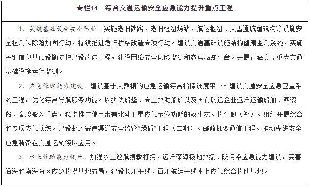健全綜合交通運輸應(yīng)急管理體制機制,完善應(yīng)急協(xié)調(diào)機制和應(yīng)急預(yù)案體系,加強交通運輸調(diào)度與應(yīng)急指揮平臺建設(shè)。推進區(qū)域性公路應(yīng)急裝備物資儲備中心建設(shè)。加強水上交通安全監(jiān)管、航海保障和救助打撈能力建設(shè),完善沿海和內(nèi)河溢油應(yīng)急設(shè)備庫,構(gòu)建陸??仗煲惑w化水上交通運輸安全保障體系。建設(shè)城市軌道交通應(yīng)急演練中心。以骨干航空物流企業(yè)為主體構(gòu)建航空應(yīng)急服務(wù)網(wǎng)絡(luò)。建設(shè)海事監(jiān)管指揮系統(tǒng)。在開展城市交通基礎(chǔ)設(shè)施地下空間、低洼區(qū)域、重點區(qū)段、重要點位、關(guān)鍵設(shè)施等隱患排查基礎(chǔ)上,建立健全風(fēng)險臺賬和災(zāi)害隱患清單,補齊設(shè)施設(shè)備、應(yīng)急搶險物資等短板,持續(xù)完善應(yīng)急處置預(yù)案,健全應(yīng)急響應(yīng)機制,提升應(yīng)對極端天氣能力。加強應(yīng)急專業(yè)隊伍和志愿者隊伍建設(shè),充實國家應(yīng)急運輸儲備力量。健全應(yīng)對重大疫情、防范應(yīng)對恐怖襲擊、保障信息安全等非傳統(tǒng)安全應(yīng)急指揮體系和應(yīng)急交通組織。