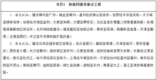 建設(shè)現(xiàn)代化鐵路網(wǎng)。堅持客貨并重、新建改建并舉、高速普速協(xié)調(diào)發(fā)展,加快普速鐵路建設(shè)和既有鐵路擴能改造,著力消除干線瓶頸,推進既有鐵路運能緊張路段能力補強,加快提高中西部地區(qū)鐵路網(wǎng)覆蓋水平。加強資源富集區(qū)、人口相對密集脫貧地區(qū)的開發(fā)性鐵路和支線鐵路建設(shè)。推進高速鐵路主通道建設(shè),提升沿江、沿海、呼南、京昆等重要通道以及京滬高鐵輔助通道運輸能力,有序建設(shè)區(qū)域連接線。綜合運用新技術(shù)手段,改革創(chuàng)新經(jīng)營管理模式,提高鐵路網(wǎng)整體運營效率。統(tǒng)籌考慮運輸需求和效益,合理規(guī)劃建設(shè)鐵路項目,嚴控高速鐵路平行線路建設(shè)。