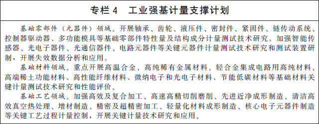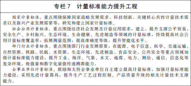 (十九)推進(jìn)計量標(biāo)準(zhǔn)建設(shè)。改革計量標(biāo)準(zhǔn)體系架構(gòu),統(tǒng)籌考慮技術(shù)能力和現(xiàn)實(shí)需求,建立國家計量標(biāo)準(zhǔn)、社會公用計量標(biāo)準(zhǔn)、部門行業(yè)計量標(biāo)準(zhǔn)、企事業(yè)單位計量標(biāo)準(zhǔn)為主體的層次分明、鏈條清晰的計量標(biāo)準(zhǔn)基礎(chǔ)設(shè)施網(wǎng)絡(luò)。實(shí)施計量標(biāo)準(zhǔn)能力提升工程,在重點(diǎn)領(lǐng)域新建一批國家計量標(biāo)準(zhǔn),加快推進(jìn)各級各類計量標(biāo)準(zhǔn)技術(shù)改造和升級換代。建立嵌入式、芯片級、小型化的計量標(biāo)準(zhǔn),推動對制造過程的實(shí)時在線測量和最佳控制。