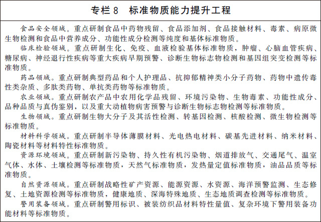 (二十)加大標(biāo)準(zhǔn)物質(zhì)研制應(yīng)用。建立完善以國家基準(zhǔn)物質(zhì)、國家標(biāo)準(zhǔn)物質(zhì)和工作標(biāo)準(zhǔn)物質(zhì)為主要組成部分的標(biāo)準(zhǔn)物質(zhì)體系。實(shí)施標(biāo)準(zhǔn)物質(zhì)能力提升工程,加快生命科學(xué)、生物醫(yī)藥、環(huán)境監(jiān)測、食品安全、自然資源、刑事司法等重點(diǎn)領(lǐng)域的標(biāo)準(zhǔn)物質(zhì)研制和應(yīng)用。加強(qiáng)標(biāo)準(zhǔn)物質(zhì)監(jiān)管能力建設(shè)和關(guān)鍵共性技術(shù)研究,提升標(biāo)準(zhǔn)物質(zhì)不確定度水平。探索建立標(biāo)準(zhǔn)物質(zhì)質(zhì)量追溯制度,建設(shè)一批標(biāo)準(zhǔn)物質(zhì)量值核查驗(yàn)證實(shí)驗(yàn)室,建立標(biāo)準(zhǔn)物質(zhì)質(zhì)量追溯平臺,形成研發(fā)、生產(chǎn)、應(yīng)用全壽命周期的監(jiān)管能力。