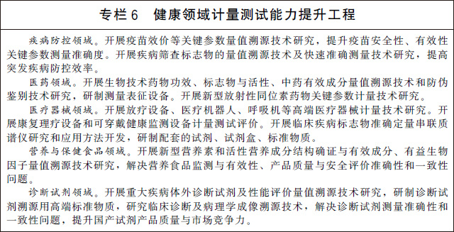 (十五)服務(wù)大眾健康與安全。加快醫(yī)療健康領(lǐng)域計量服務(wù)體系建設(shè),圍繞疾病防控、生物醫(yī)藥、診斷試劑、高端醫(yī)療器械、康復(fù)理療設(shè)備、可穿戴設(shè)備、營養(yǎng)與保健食品等開展關(guān)鍵計量測試技術(shù)研究和應(yīng)用。加強(qiáng)體育設(shè)施和器材計量技術(shù)研究和測試服務(wù),促進(jìn)體育產(chǎn)業(yè)高質(zhì)量發(fā)展。完善地質(zhì)和海洋災(zāi)害、地震、洪澇干旱、森林草原火災(zāi)等自然災(zāi)害防御的計量保障體系,提高防災(zāi)、減災(zāi)、救災(zāi)計量能力。加強(qiáng)危險化學(xué)品、礦山、建筑施工、地質(zhì)勘查等安全生產(chǎn)相關(guān)計量器具的研制生產(chǎn)和監(jiān)督管理。加強(qiáng)公共安全領(lǐng)域計量服務(wù)體系建設(shè),開展交通安全、社會穩(wěn)定和安全等領(lǐng)域關(guān)鍵計量測試技術(shù)研究和應(yīng)用,推進(jìn)交通監(jiān)管設(shè)備、警用裝備、刑事技術(shù)產(chǎn)品等計量測試基礎(chǔ)設(shè)施建設(shè)。
