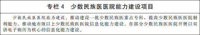 3.發(fā)展少數(shù)民族醫(yī)藥。加強少數(shù)民族醫(yī)醫(yī)療機構(gòu)建設(shè),提高民族地區(qū)基層醫(yī)療衛(wèi)生機構(gòu)少數(shù)民族醫(yī)藥服務(wù)能力。改善少數(shù)民族醫(yī)醫(yī)院基礎(chǔ)設(shè)施條件,加強少數(shù)民族醫(yī)醫(yī)院??颇芰Α⒅苿┠芰托畔⒒芰ㄔO(shè)。建立符合少數(shù)民族醫(yī)醫(yī)療機構(gòu)自身特點和發(fā)展規(guī)律的績效評價指標(biāo)體系。加大少數(shù)民族醫(yī)藥防治重大疾病和優(yōu)勢病種研究力度,有效傳承特色診療技術(shù)和方法。鼓勵和扶持少數(shù)民族醫(yī)藥院校教育、師承教育和繼續(xù)教育。加大對少數(shù)民族醫(yī)藥的傳承保護(hù)力度,持續(xù)開展少數(shù)民族醫(yī)藥文獻(xiàn)搶救整理工作,推動理論創(chuàng)新和技術(shù)創(chuàng)新。